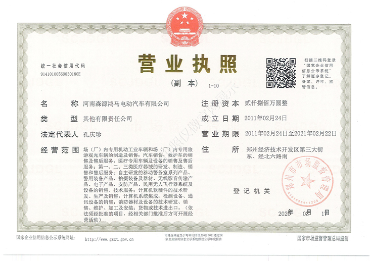 河南森源鴻馬電動(dòng)汽車有限公司位于國(guó)家中心城市——鄭州,是集特種專用車研發(fā)、制造與銷售為一體的國(guó)家高新技術(shù)企業(yè),河南省知識(shí)產(chǎn)權(quán)優(yōu)勢(shì)企業(yè),隸屬中國(guó)五百?gòu)?qiáng)森源集團(tuán)重點(diǎn)骨干企業(yè),公司生產(chǎn)工藝先進(jìn)、檢測(cè)設(shè)備齊全,擁有國(guó)內(nèi)領(lǐng)先的整車沖壓、焊接、涂裝、總裝、檢測(cè)生產(chǎn)線,獲得國(guó)家授權(quán)專利200多項(xiàng),相繼通過(guò)了公安部特種警用裝備質(zhì)量監(jiān)督檢驗(yàn)中心認(rèn)證、國(guó)家工程機(jī)械質(zhì)量監(jiān)督檢驗(yàn)中心認(rèn)證、ISO9001質(zhì)量管理體系認(rèn)證、ISO14001環(huán)境管理體系認(rèn)證、ISO18001職業(yè)健康安全管理體系認(rèn)證、售后服務(wù)五星級(jí)認(rèn)證和知識(shí)產(chǎn)權(quán)管理體系認(rèn)證。