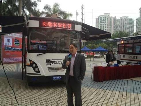 這里是警用裝備博覽會(huì)的現(xiàn)場(chǎng),大家現(xiàn)在所看到的是一輛由環(huán)保電動(dòng)車(chē)改裝而成的警務(wù)車(chē),它的基本配備可以為三到五位警員提供日常辦公,也就是一個(gè)流動(dòng)的派出所。大家可以看到,這兒還設(shè)有一個(gè)便民窗口,也就是說(shuō)在街上就可以直接受理案件和提供相關(guān)的便民服務(wù)。