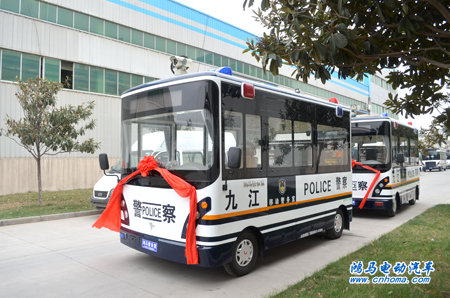 3月29日下午,在河南森源鴻馬電動汽車公司舉行江西省九江市九江縣鴻馬流動警務(wù)室發(fā)車儀式。