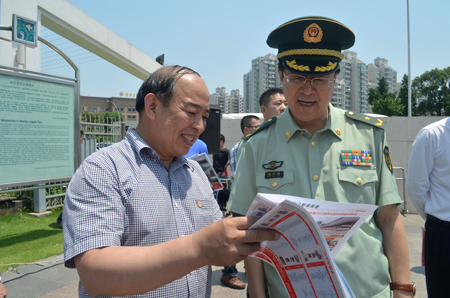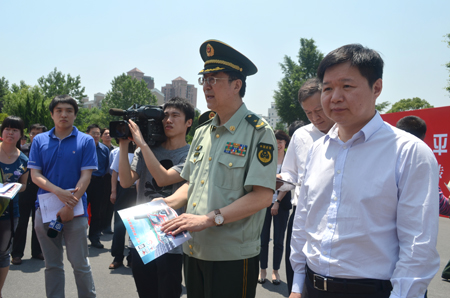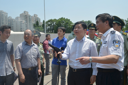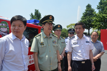上海市消防局局長趙子新與閘北區(qū)區(qū)長安路生一起觀看消防車功能演示