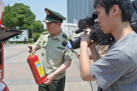 消防官兵為記者演示消防宣傳車上配備的滅火器