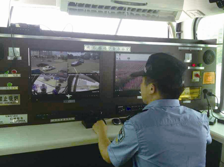 移動(dòng)警務(wù)室身長(zhǎng)6米,看似不大,設(shè)備可不少。車頂可360度全方位旋轉(zhuǎn)的攝像機(jī)和車內(nèi)兩個(gè)固定攝像頭,像犀利的鷹眼,掃視著四面八方,全天候全景采集周邊情況,在系統(tǒng)硬盤上實(shí)時(shí)記錄,通過(guò)無(wú)線3G網(wǎng)絡(luò)實(shí)時(shí)傳送到市公安局指揮中心。