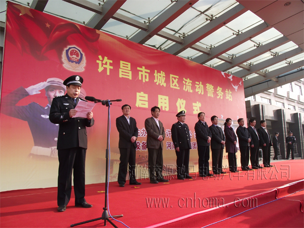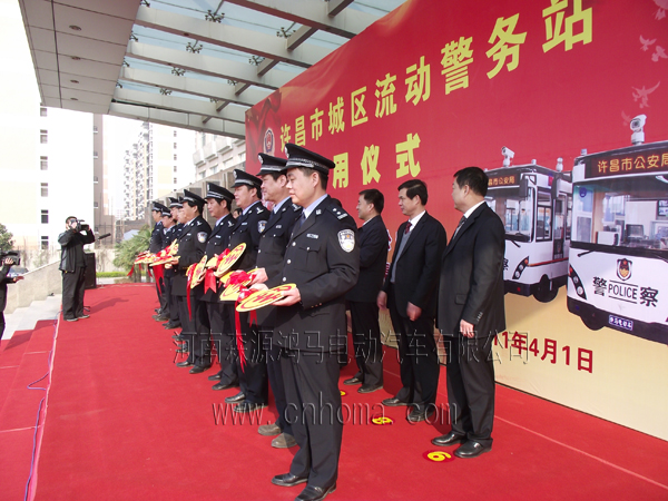 4月1日上午,鴻馬流動警務(wù)室電動警車巡邏車在河南許昌市公安局廣場舉行警企聯(lián)動保平安流動警務(wù)室進(jìn)城區(qū)流動警務(wù)站進(jìn)社區(qū)啟動儀式,10輛移動警務(wù)室集中進(jìn)社區(qū)村居開展治安巡邏。許昌市委書記李亞,長葛市委書記王文杰,許昌市副市長、公安局局長翟化夫  森源集團(tuán)董事長楚金甫等領(lǐng)導(dǎo)出席啟動儀式。公安分局黨委成員、各內(nèi)設(shè)機(jī)構(gòu)、直屬單位、派出所負(fù)責(zé)人,社區(qū)民警共300余人參加啟動儀式。