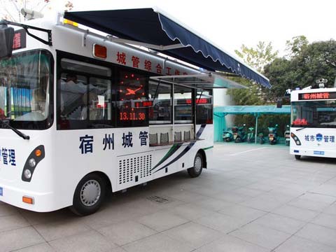 宿州城管綜合工作室不僅美觀、空間大,而且選用低碳環(huán)保的電力驅(qū)動(dòng),同時(shí)配有220伏供電系統(tǒng),集服務(wù)平臺、指揮平臺、監(jiān)控平臺、宣傳平臺、管理平臺于一體。結(jié)合當(dāng)前城市管理督查范圍劃分,宿州城管綜合工作室將停放在市區(qū)東南、東北、西南、西北四個(gè)主要區(qū)域,具體地點(diǎn)為人口流動(dòng)量大、管理復(fù)雜地段,考慮電源問題,一般相對固定停放點(diǎn),每輛綜合工作室開放一個(gè)辦公窗口,向過往市民提供各類服務(wù)。