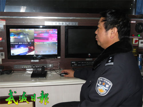 1月10日訊  民警在移動警務室監(jiān)控街面情況。涼州公安分局東大街派出所自設立流動警務室以來,轄區(qū)的治安秩序好轉(zhuǎn),警情案件下降,服務群眾效果不斷顯現(xiàn),警民關(guān)系不斷融洽,受到轄區(qū)居民及企事業(yè)單位的好評。