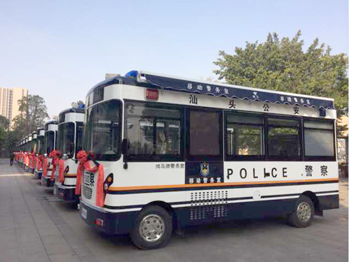 據悉,此次交付的十八臺汽油移動警務室是河南森源鴻馬電動汽車有限公司的全新力作,記者在現場看到,這十八臺移動警務室外觀非!袄L”,據河南森源鴻馬電動汽車有限公司總經理馬鴻軍介紹:這十八名“安全戰(zhàn)士”長6米,寬2.3米,室內高度達2.2米,擁有超大的辦公空間,能夠滿足警務人員的辦公需要,車身兩邊“汕頭公安”“警察”字樣醒目,車頂安裝的攝像頭能夠360°旋轉,伴隨著閃爍的警燈,這18臺移動警務室想不引人注意都難。同時他介紹說:此次交付的這18臺移動警務室具有“打 防 管 控”等十八般“武藝”,并可充分發(fā)揮隨時移動、裝備水平高、服務設施全的優(yōu)勢,近距離打防犯罪,零距離服務群眾,實現警務向基層延伸,警力向街面前移,最大限度擠壓犯罪空間,最大限度震懾犯罪分子,努力提高警情發(fā)現率、案件預防率和嫌犯抓獲率,將能夠成為汕頭公安維護治安的重要陣地、服務百姓的新型平臺、展示形象的亮麗窗口,為實現“富裕、人文、生態(tài)、和諧”的“平安汕頭 ”作出貢獻。