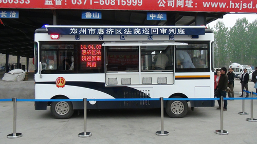 據(jù)了解,昨日這起案件的審理,是鄭州市法院系統(tǒng)首輛巡回審判車的首次開庭使用。