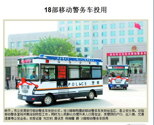 相關(guān)新聞報(bào)道: 鴻馬移動警務(wù)室亮相汕頭 加強(qiáng)轄區(qū)治安防控 |