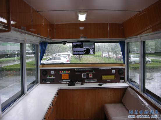 4臺北京奧林匹克公園流動警務(wù)室按照客戶的要求進(jìn)行了車內(nèi),車外的適當(dāng)改裝,在車頂加裝了一個可升降的探照燈攝像頭,可以將園內(nèi)周邊情況傳輸?shù)杰噧?nèi)的監(jiān)視器上,讓執(zhí)勤的民警快速、準(zhǔn)確的鎖定可疑人員,加強了園內(nèi)的治安安全。在車頭上部也加裝了一個長方形的高爆閃燈,使得車的整體看起來更加的美觀,也給犯罪分子起到了震懾的作用。