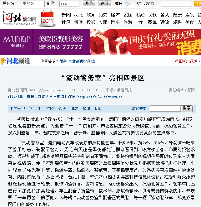 承德日?qǐng)?bào)訊(記者喬溪)“十一”黃金周期間,德匯門前停放的多功能警車成為市民、游客駐足觀看的新亮點(diǎn)。為迎接“十一”的到來,市公安局旅游分局新購(gòu)置了4輛“流動(dòng)警務(wù)室”, 投入到避暑山莊、普陀宗乘之廟、普寧寺、磬錘峰四大景區(qū)內(nèi)治安狀況復(fù)雜的重點(diǎn)部位。