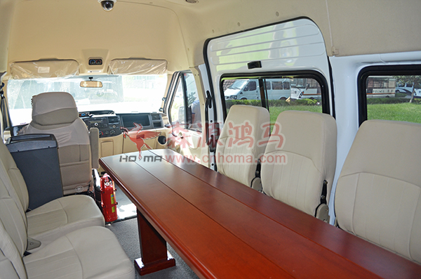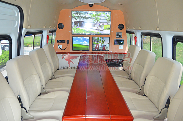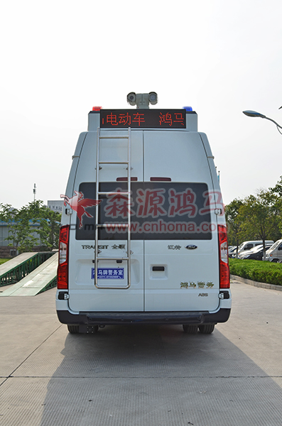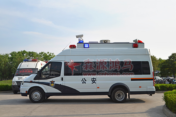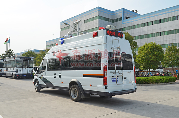 采用全順改裝而成,車頂安裝紅藍(lán)爆閃警燈,車身兩側(cè)安裝紅藍(lán)頻閃燈,車內(nèi)配有先進(jìn)和完備的現(xiàn)場辦公系統(tǒng)、警報(bào)系統(tǒng)、實(shí)時(shí)監(jiān)控系統(tǒng)、廣播系統(tǒng)、照明及攝像系統(tǒng)等。整車按功能分為駕駛艙和工作艙兩部分,駕駛艙與工作艙隔開。通過車載設(shè)備對(duì)現(xiàn)場音頻、視頻數(shù)據(jù)進(jìn)行采集、備份,與后方指揮中心建立實(shí)時(shí)通訊及信息傳遞,經(jīng)由該網(wǎng)絡(luò)實(shí)現(xiàn)視頻及遠(yuǎn)程指揮工作,廣泛應(yīng)用于公安、武警、法院、檢察院等執(zhí)法部門。