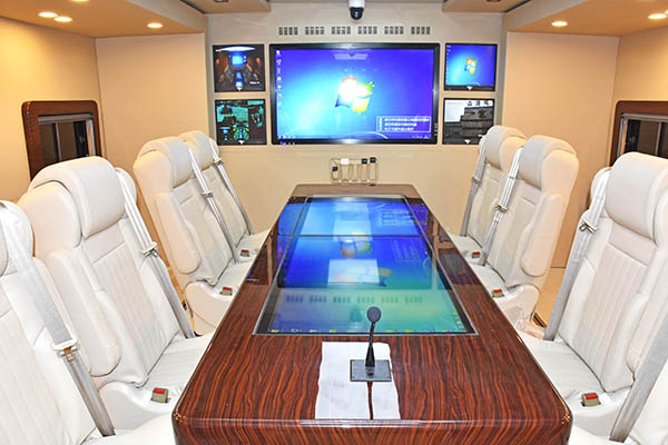 整車具備完善的通訊組網(wǎng)系統(tǒng)、北斗定位系統(tǒng)、視頻會(huì)議系統(tǒng)、音視頻取證系統(tǒng)、移動(dòng)辦公系統(tǒng),可實(shí)現(xiàn)野外開展視頻會(huì)議、決策指揮,能夠快速對(duì)突發(fā)事件進(jìn)行全方位一體化組織、策劃、協(xié)調(diào)及控制。